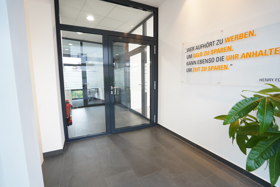 Über das Treppenhaus gelangen Sie zur separat gelegenen Bürofläche, die das gesamte Obergeschoss einnimmt. Der großzügige Flur ist innenliegend und dank der verglasten Türelemente angenehm lichtdurchflutet. Von hier aus sind alle Büroräume sowie das Besprechungszimmer direkt erreichbar. Zusätzlich stehen getrennte WC-Anlagen für Damen und Herren, eine Küche und ein Aktenraum zur Verfügung. Das Besprechungszimmer ist nach Süden ausgerichtet und bietet Zugang zur großen Dachterrasse.