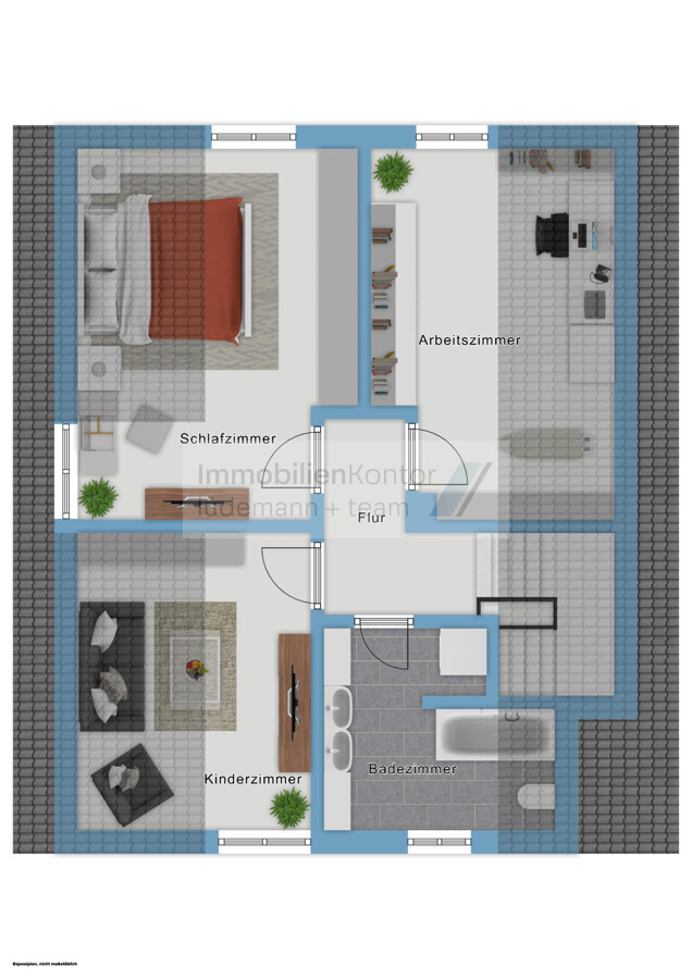 Im Dachgeschoss stehen Ihnen drei flexibel nutzbare Zimmer zur Verfügung, die sich ideal als Schlaf-, Kinder-, Arbeits- oder Gästezimmer eignen. Das helle Badezimmer ist mit einer Duschbadewanne sowie zwei Waschbecken ausgestattet. Zusätzlich befindet sich hier ein Waschmaschinenanschluss, der den Alltag komfortabel gestaltet. Überwiegend sind die Fenster mit Außenrollläden ausgestattet.