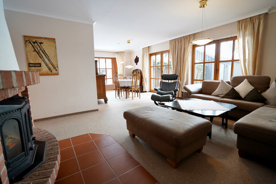 Das Herzstück des Hauses bildet der großzügige Wohn- und Essbereich mit Blick in den Garten. Ein Kamin sorgt hier für eine behagliche Atmosphäre und lädt besonders in den kälteren Monaten zum Verweilen ein. Der offene Essbereich bietet genügend Platz für gesellige Stunden mit Familie und Freunden.