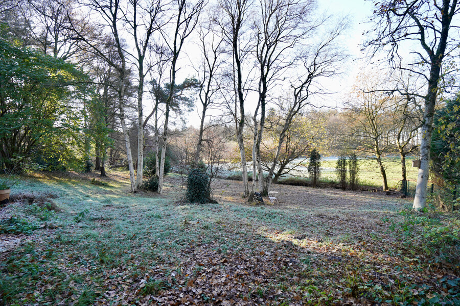 Das 2.802 m² große Grundstück ist ein kleines Naturparadies mit altem Baumbestand, Rasenflächen, Sträuchern und einem angrenzenden Bachlauf. Dahinter öffnet sich weitläufiges Grünland – ein Ort zum Entspannen, Spielen und Genießen.