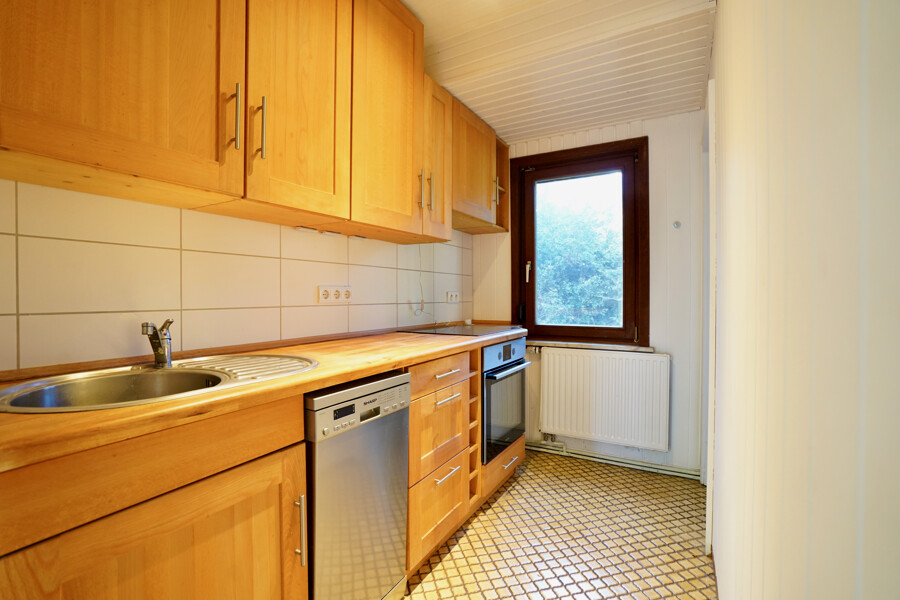 Zwei Bäder – eines mit Wanne, eines mit Dusche – und die praktische Massivholzküche mit Induktionskochfeld, Backofen und Geschirrspüler runden das Raumangebot ab. Geflieste Böden im Erdgeschoss und pflegeleichter Vinylboden im Obergeschoss sorgen für komfortable Nutzung. Beheizt wird das Haus über Wandheizkörper und eine moderne Gas-Brennwerttherme.