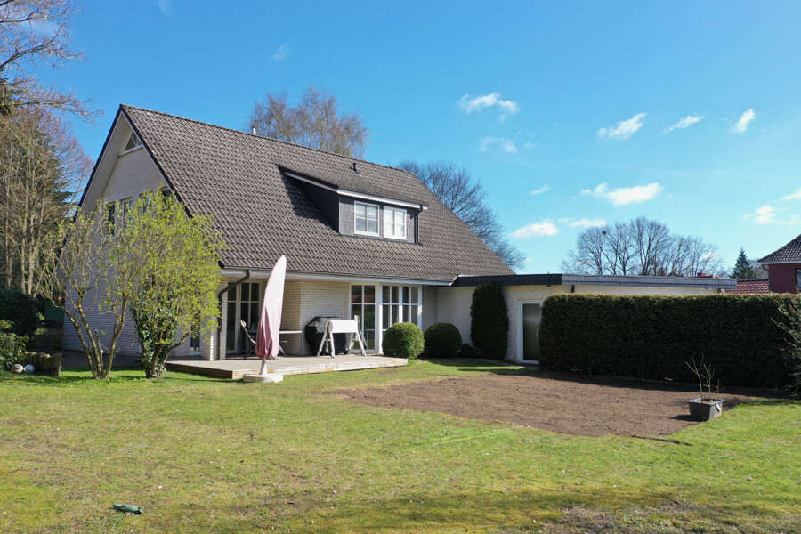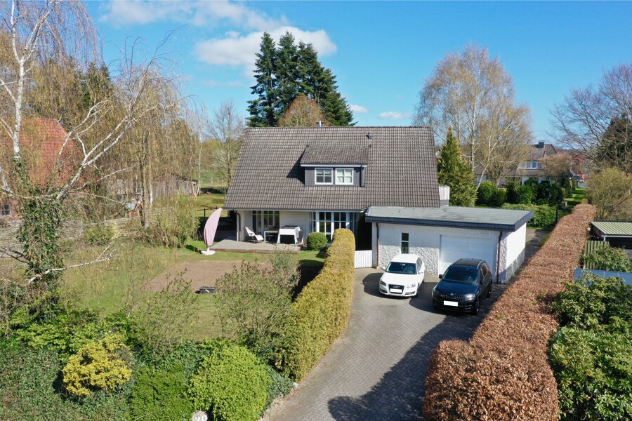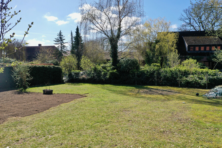 Das 1.283 m² große Grundstück ist pflegeleicht angelegt und durch einen bepflanzten Wall nahezu uneinsehbar. Im vorderen Bereich stehen eine offene Garage sowie ein zusätzlicher Stellplatz im Freien zur Verfügung. Ein Holz-Doppelcarport im hinteren Bereich bietet praktische Abstellfläche für Kaminholz, Gartengeräte oder Fahrräder, ist jedoch nicht mit dem Auto befahrbar.