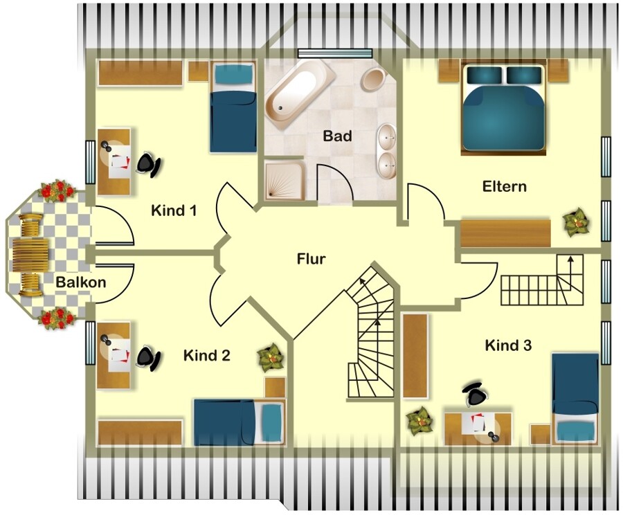 Im Dachgeschoss erwarten Sie vier großzügige Zimmer, die vielfältige Nutzungsmöglichkeiten bieten. Zwei der Räume verfügen über direkten Zugang zu einem Balkon. Ein weiteres Zimmer bietet über eine Raumspartreppe Zugang zum ausgebauten Spitzboden, der zusätzlichen Raum schafft. Das Badezimmer überzeugt durch seine helle Gestaltung mit Badewanne und Dusche.