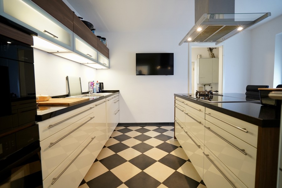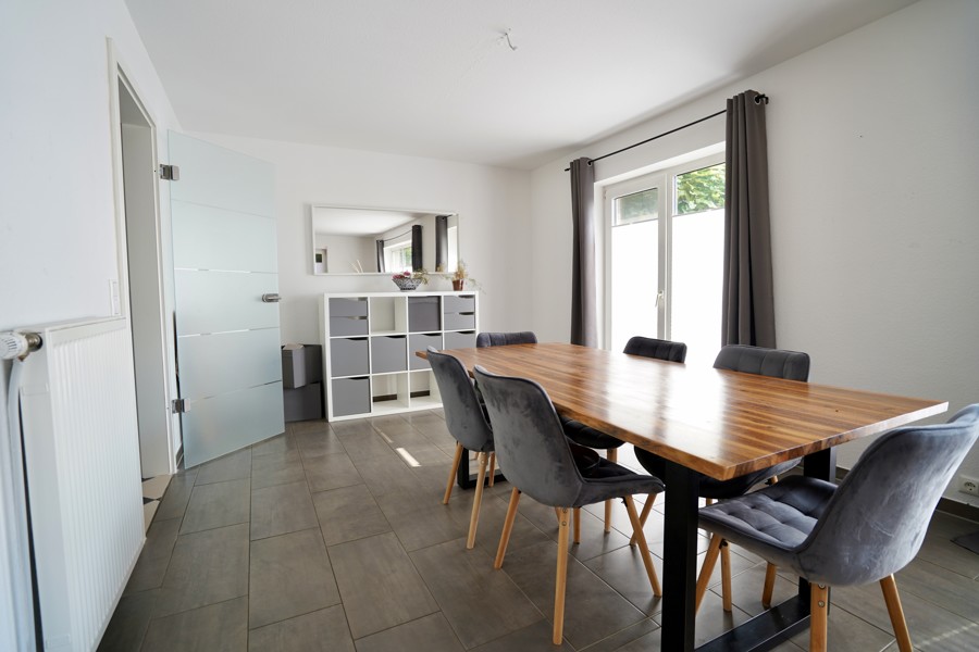 Die Küche ist ausgestattet mit einer modernen Kücheninsel. Hier finden sich eine Gasherdplatte und ein Ceranfeld von Neff sowie einen integrierte Kaffeevollautomat und ein Bosch-Ofen in der Schrankwand. Direkt angrenzend zur Küche liegt ein praktischer Hauswirtschaftsraum mit Waschmaschinenanschluss. Von hier aus haben Sie einen weiteren Ausgang zur Carportanlage, sodass Einkäufe trockenen Fußes in Haus gebracht werden können.