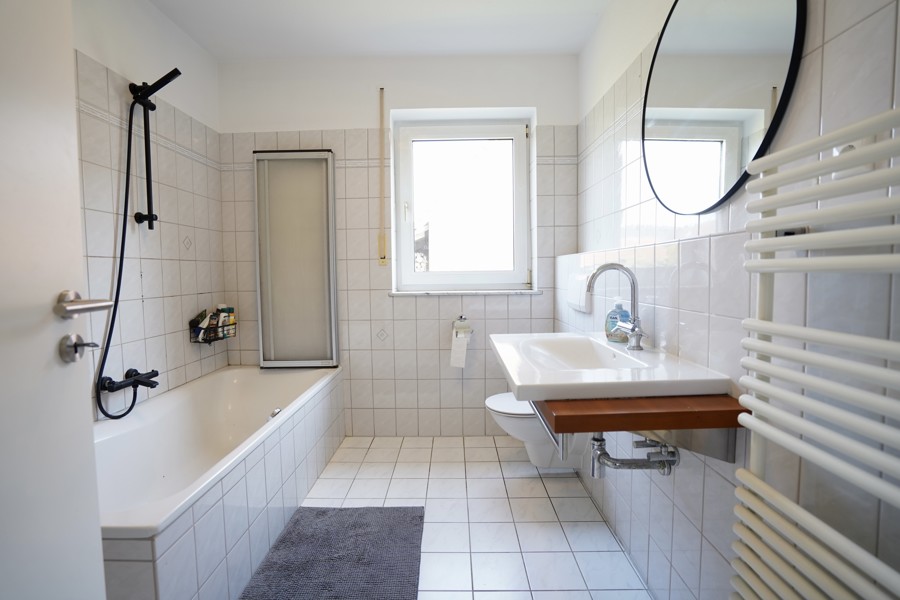 Das Erdgeschoss mit einer Größe von ca. 95 m² ist überwiegend gefliest und empfängt Sie mit einer großzügigen Diele. Von hier aus erreichen Sie das Gäste-WC, das Büro und das Ankleidezimmer. Das Badezimmer mit Badewanne und Handtuchheizkörper bietet zusätzlichen Komfort. Im lichtdurchfluteten Wohnzimmer beeindrucken die großen Fenster und ein gemütlicher Kamin, außerdem gelangen Sie auf die Terrasse, die mit einer ausfahrbaren Markise zum Entspannen im Freien einlädt.