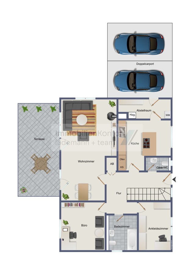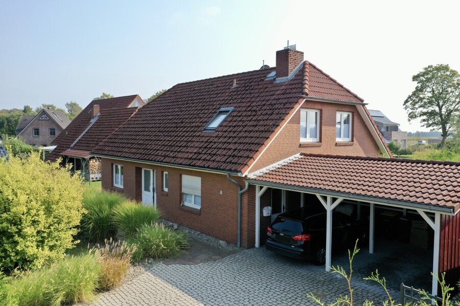 Der Außenbereich verfügt über einen Doppelcarport und einem Schuppen im Garten. Das 1.122 m² großen Grundstück ist voll umzäunt.