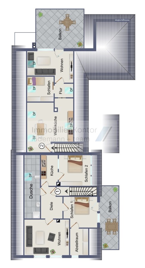 Die Gesamtwohnfläche von ca. 334 m² verteilt sich auf fünf Wohnungen, jeweils mit Bad und Küche: