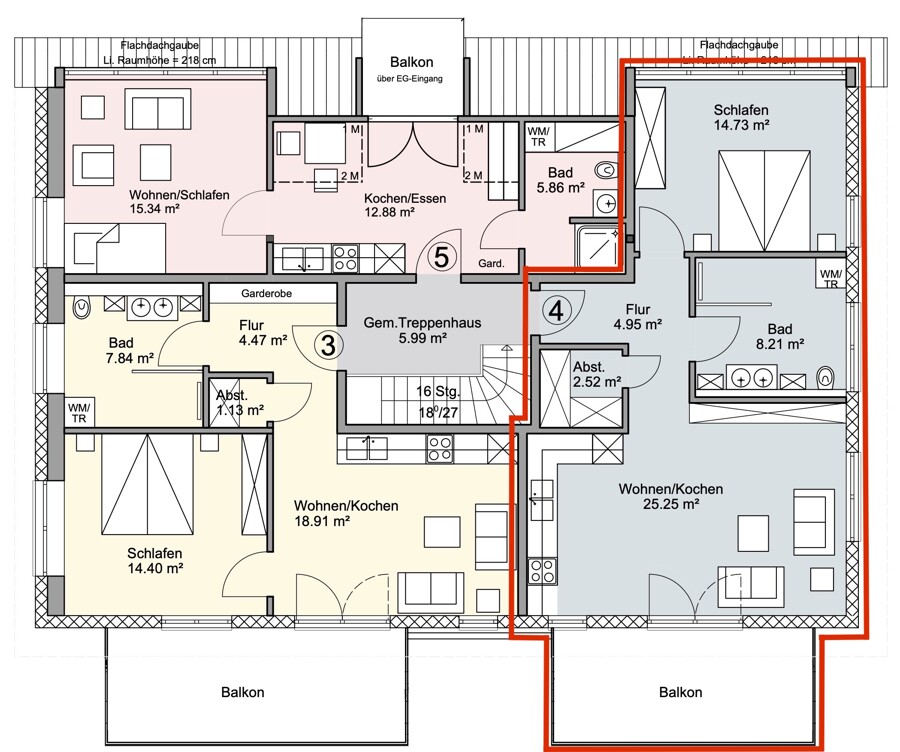 Im Dachgeschoss entstehen drei attraktive Wohneinheiten. Die ca. 60 m² große 2-Zimmer-Wohnung verfügt über eine offene Einbauküche, einen Abstellraum, ein Duschbad und einen Balkon in Gartenausrichtung. Diese Wohnung ist mit wenigen Dachschrägen konzipiert.