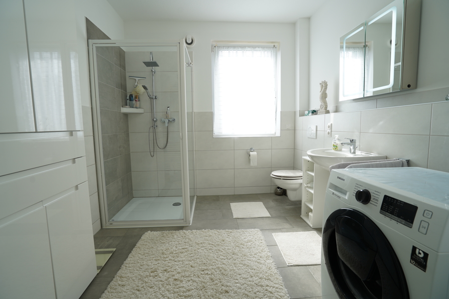 Als KfW-55-Effizienzhaus überzeugt die Immobilie durch ihren besonders niedrigen Energieverbrauch und steht somit für nachhaltiges und kosteneffizientes Wohnen. Die überdachte Terrasse bietet einen geschützten Außenbereich und lädt zum Entspannen und Verweilen ein.