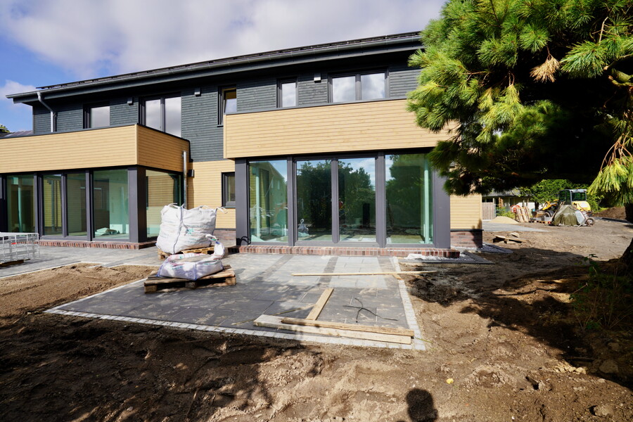 - Dunkelfarbige Blendrahmenfenster und Außentüren aus Kunststoff oder Holz mit Wärmeschutzisolierverglasung
