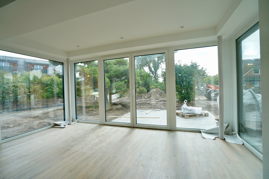 Im Erdgeschoss befindet sich diese 3-Zimmer-Wohnung. Sie verfügt über ein Duschbad, ein separates Gäste-WC, eine Speisekammer, eine Terrasse sowie einen zusätzlichen, offenen Wohnbereich mit vollständig verglasten Außenwänden – in der Gestaltung einem Wintergarten ähnlich.