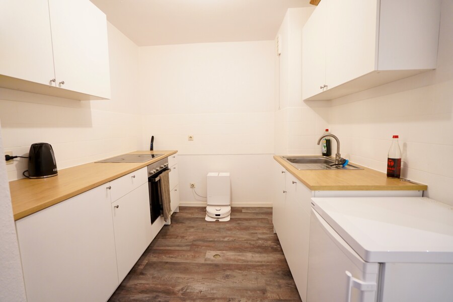 Der Wohn- und Schlafbereich bildet das Herzstück der Wohnung und bietet direkten Zugang zur Loggia. Die Küche ist offen zum Flur und mit einer Einbauküche ausgestattet.