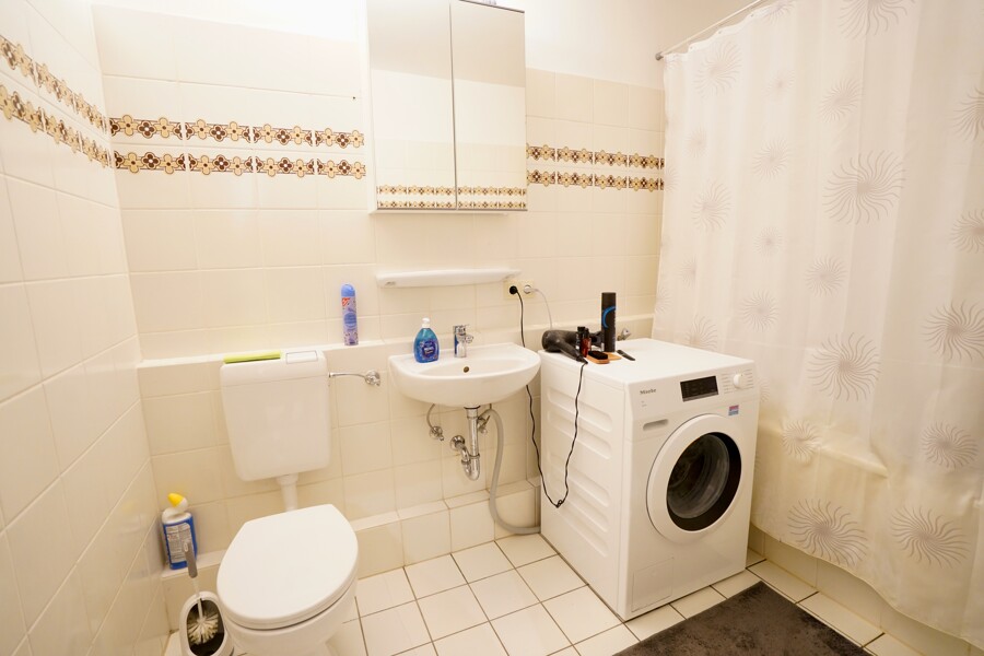 Im Flur befindet sich ein eingebauter Wandschrank, der zusätzlichen Stauraum bietet. Das Badezimmer ist mit einer Badewanne ausgestattet und verfügt über einen Anschluss für eine Waschmaschine.