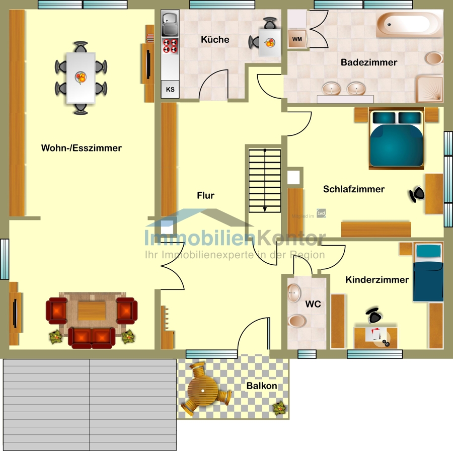 Im Erdgeschoss empfängt Sie ein freundlicher Flur mit Garderobenbereich sowie eines der drei Schlafzimmer. Eine mit Teppich belegte Holztreppe führt in das Obergeschoss, das den Mittelpunkt der Wohnung bildet. Von der großzügigen Diele aus erreichen Sie alle Räume – und auch den Balkon, der zum Verweilen im Freien einlädt.