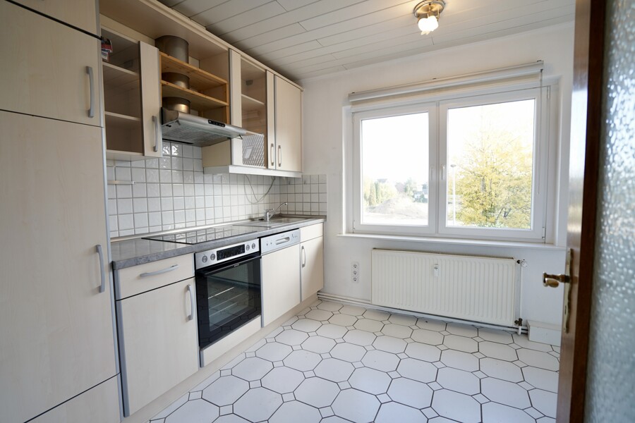 Das modernisierte Vollbad ist in hellen Weiß- und Beigetönen gestaltet und auch mit einem Vinylboden ausgestattet. Die Küche präsentiert sich mit einer hellen Einbauküche inklusive aller wichtigen Elektrogeräte.