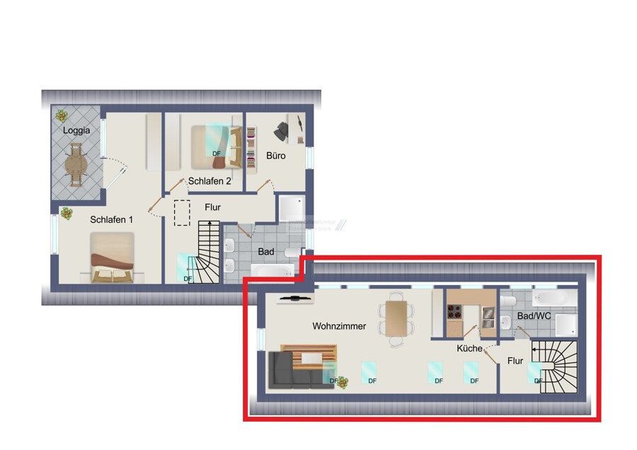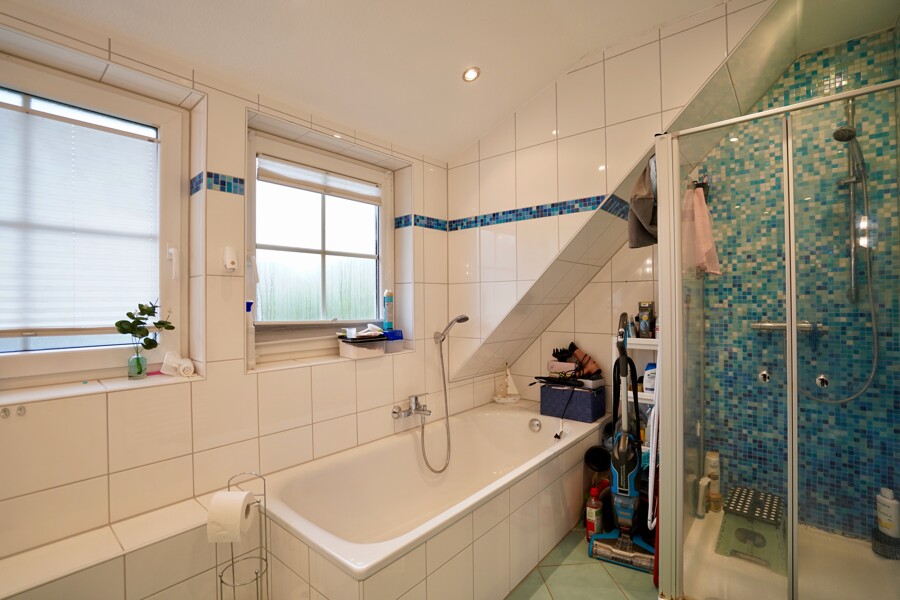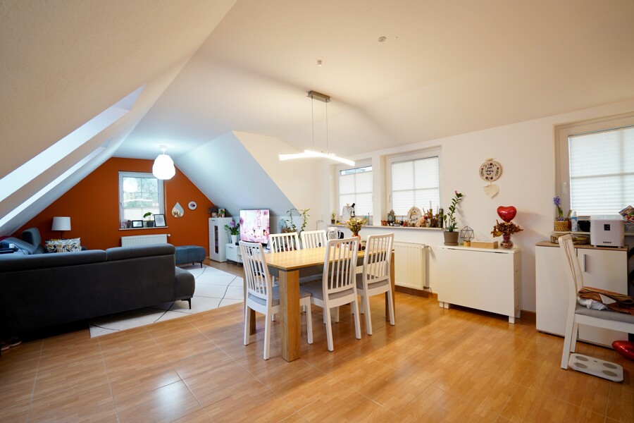 Das Dachgeschoss bietet ein helles Badezimmer mit Dusche und Badewanne, eine Einbauküche sowie ein großzügiges Wohn- und Esszimmer mit angenehmer Wohnatmosphäre und viel Platz zur individuellen Entfaltung.